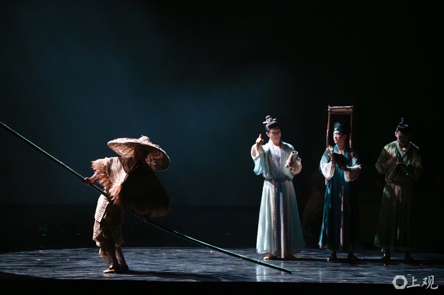 当晚的演出中,舞剧以明代科学家宋应星的人生轨迹为脉络,以其传世巨著《天工开物》为核心,用 “赶考”“著书”“山河” 三大篇章串联起整部作品的精神内核,将舞蹈、影像与现代科技精妙融合,让三百多年前宋应星踏遍山河、著书立说的历程鲜活呈现于舞台。